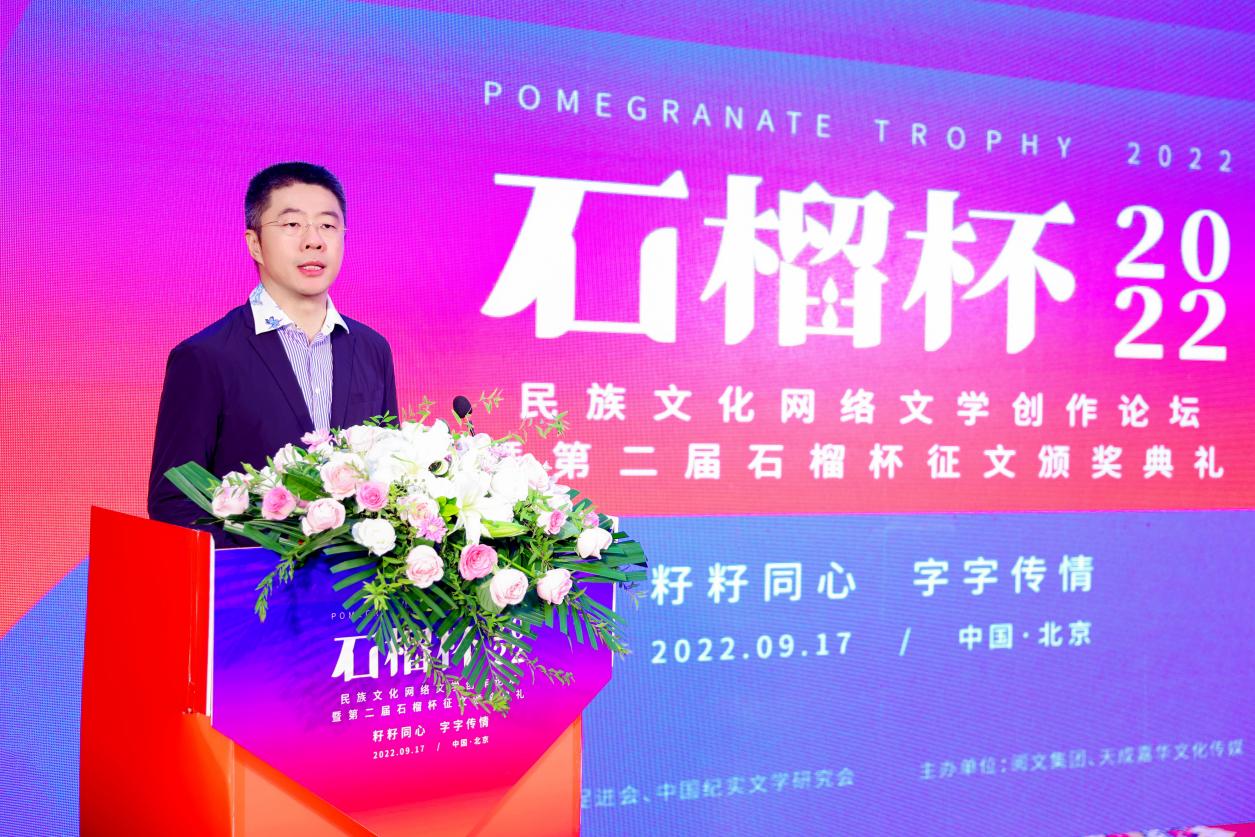 2022年9月17日,民族文化網(wǎng)絡(luò)文學創(chuàng)作論壇暨第二屆石榴杯征文頒獎活動在民族文化宮舉行。本次活動得到了國家民委所屬中國少數(shù)民族文化藝術(shù)促進會和中國紀實文學研究會的指導與支持,由閱文集團、北京天成嘉華文化傳媒主辦,天成達星國際傳媒承辦。