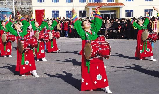 長鼓舞是朝鮮族代表性的舞蹈之一,脫胎于傳統(tǒng)的“農(nóng)樂舞”。長鼓分為長鼓、舞蹈長鼓、兒童長鼓和幼兒長鼓等幾種。形狀是兩頭粗、中間細(xì),左邊鼓筒直徑比右邊鼓筒直徑大1厘米,右邊鼓皮薄,左邊鼓皮厚。