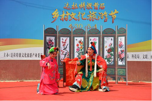 達(dá)拉特道情富有濃郁的地方色彩,生、旦、丑等行當(dāng)齊全,包括“唱、念、做、打”四功,不過(guò)由于它演唱內(nèi)容的關(guān)系,以“唱、念、做”三功為主。音樂(lè)體制主要為曲牌連綴體,同時(shí)吸收了地方小戲與北路梆子的音樂(lè)元素,又兼有地方大戲的部分唱腔曲調(diào),演唱方式以坐唱為主,樂(lè)器伴奏分為文場(chǎng)和武場(chǎng),音樂(lè)婉轉(zhuǎn)纏綿、節(jié)奏明快,曲調(diào)開(kāi)朗而流暢,唱白多運(yùn)用地方方言,藝術(shù)風(fēng)格柔美而抒情,充盈了濃郁的鄉(xiāng)土生活氣息。