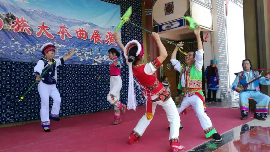 慶洞村有一支白族繞三靈文藝隊,全都由村里的文藝愛好者組成,何松康是文藝隊的主力?!叭?0多人,霸王鞭都是我?guī)С鰜淼?,都可以算作我的徒弟,平時沒事大家就一起練習表演,有活動了就一起參加活動,傳承傳統(tǒng)文化的同時,還可以補貼一點收入”,何松康說。
