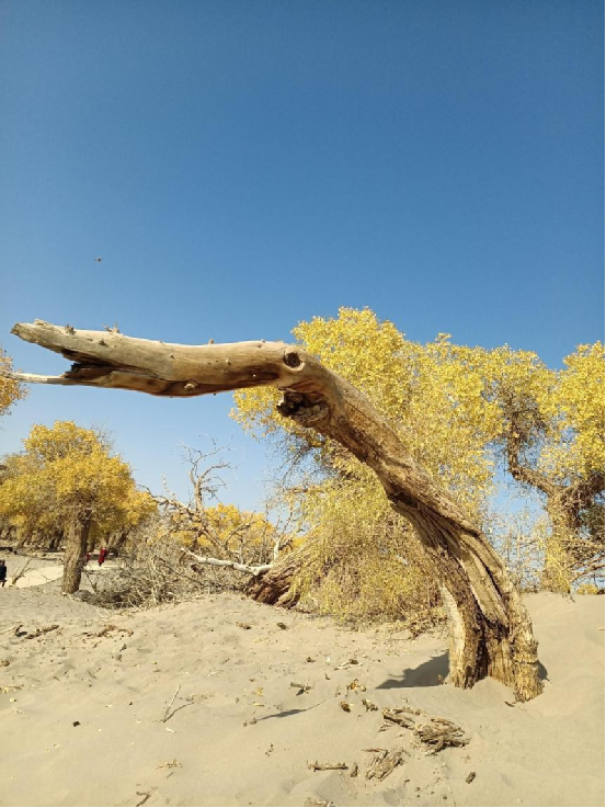 每當(dāng)深秋季節(jié),胡楊樹葉變得一片金黃,形成胡楊秋色,樹影婆娑,奇妙絕倫,賞心悅目。漫步在濃郁的胡楊林中仿佛進(jìn)入神話般的仙境。茂密的胡楊千奇百怪,神態(tài)萬般。粗壯的幾人難以合抱,挺拔的七、八丈之高,怪異的似蒼龍騰越,似虬蟠狂舞,令人驚奇不已,嘆為觀止。僅就密密匝匝的樹葉,也是風(fēng)采獨(dú)有。幼小的胡楊,葉片狹長而細(xì)小,宛若少女嫵媚的柳眉,人們常常把它誤認(rèn)為柳樹;壯齡的胡楊,葉片又變成卵形、闊卵形或三角形,猶如興安嶺的白樺;進(jìn)入老年期的胡楊,葉片才定型為橢圓形。更令人稱奇者,在同一棵胡楊樹冠的上下層次,還長著不同形狀的葉片,因此,又稱“異葉楊”