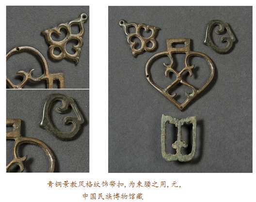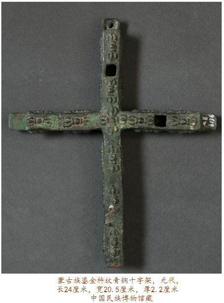 眼前此件在內(nèi)蒙古達(dá)茂旗出土的元代鎏金青銅十字架,四面排列有浮雕金剛杵紋,其正面每個(gè)金剛杵圖案上均有鎏金裝飾,十字架上部穿孔則可用于懸掛。金剛杵是藏傳佛教里的修行法器,象征力量與智慧;而十字架則是基督教文化的標(biāo)志,如此混搭,歷史便要傳遞出種種:在信仰藏傳佛教的蒙古高原,金剛杵,象征無(wú)畏圓滿,十字架,則代表救贖重生,東西方文化的結(jié)合亦呈現(xiàn)某種文明可能達(dá)到的無(wú)可比擬之高度。