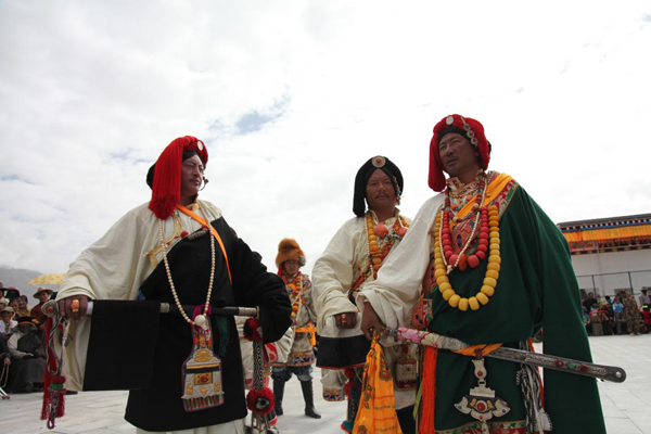 藏族分布在全國(guó)五省區(qū),因氣候、環(huán)境的不同,形成了豐富多彩的服飾文化。藏族服飾有“隔山兩個(gè)樣的”說(shuō)法,有人統(tǒng)計(jì),因地域、男女、年齡、婚否和季節(jié)的不同,藏族服飾有100多種。男裝各地大同小異,上身穿寬大的藏袍,袖長(zhǎng)及膝。束各種腰帶。寬大的藏袍非常適應(yīng)青藏高原多變的氣候,露出右臂便于勞作,天熱時(shí)將脫掉兩袖,將藏袍扎在腰間,天冷時(shí)套上雙袖。西藏人的服飾樣式很多,有衛(wèi)藏類(lèi)服飾、康巴類(lèi)服飾、安多類(lèi)服飾和拉薩裝。衛(wèi)藏主要指除昌都地區(qū)以外的西藏大部分地區(qū)。西藏大部分地區(qū)的男裝,主要衣料是氆氌,城鎮(zhèn)人多穿黑色,農(nóng)牧民多穿白色。康巴主要指西藏的昌都和青海的玉樹(shù)、果洛一帶。男子多內(nèi)穿右襟齊臍短襖,外罩圓領(lǐng)寬袖長(zhǎng)袍。頭戴狐皮帽或“扎秀”(發(fā)辮纏紅絲線(xiàn)),扎腳穿高筒靴顯得英俊瀟灑。女子穿長(zhǎng)袖衫,外罩坎肩,腰束彩條圍裙。講究腰帶和腰刀,腰帶和腰刀上要鑲嵌金銀珠寶。女子多戴名貴飾品,顯得華麗昂貴。安多藏區(qū)主要指西藏那曲與安多縣接壤的地方。過(guò)去,男裝衣領(lǐng)、袖口,下擺多飾虎豹皮,女裝邊飾多為水獺皮,而且項(xiàng)、腕、手指和腰間配有金銀寶石飾物。
