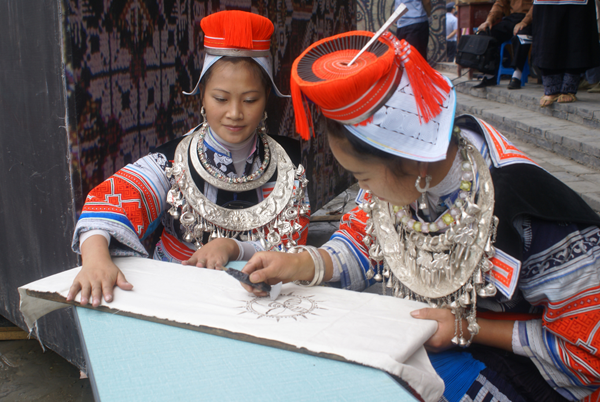 蠟染是貴州省丹寨縣、安順縣、織金縣苗族世代傳承的傳統(tǒng)技藝。 丹寨縣、安順縣及織金縣是以苗族為主體的多民族聚居區(qū),在長(zhǎng)期與外界隔絕的艱苦環(huán)境中,這里的居民逐漸形成了自給自足的生活方式,古老的蠟染技藝因此得以保留下來(lái)。按苗族習(xí)俗,所有的女性都有義務(wù)傳承蠟染技藝,每位母親都必須教會(huì)自己的女兒制作蠟染。所以苗族女性自幼便學(xué)習(xí)這一技藝,她們自己栽靛植棉、紡紗織布、畫(huà)蠟挑秀、浸染剪裁,代代傳承。在此狀況下,這些苗族聚居區(qū)形成了以蠟染藝術(shù)為主導(dǎo)的衣飾裝束(以上三照片由劉軍提供)。