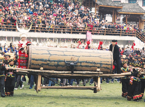 今年適逢雷山縣多個村寨過13年一次的鼓藏節(jié),2000余名苗族同胞在開幕式上再現(xiàn)了古老神秘的祭鼓儀式。鼓藏節(jié)也是緬懷先人、祭祀祖宗的古老節(jié)日,過節(jié)期間,家家宰豬祭祖,走親訪友,舉行跳蘆笙舞、斗牛等民間傳統(tǒng)活動。