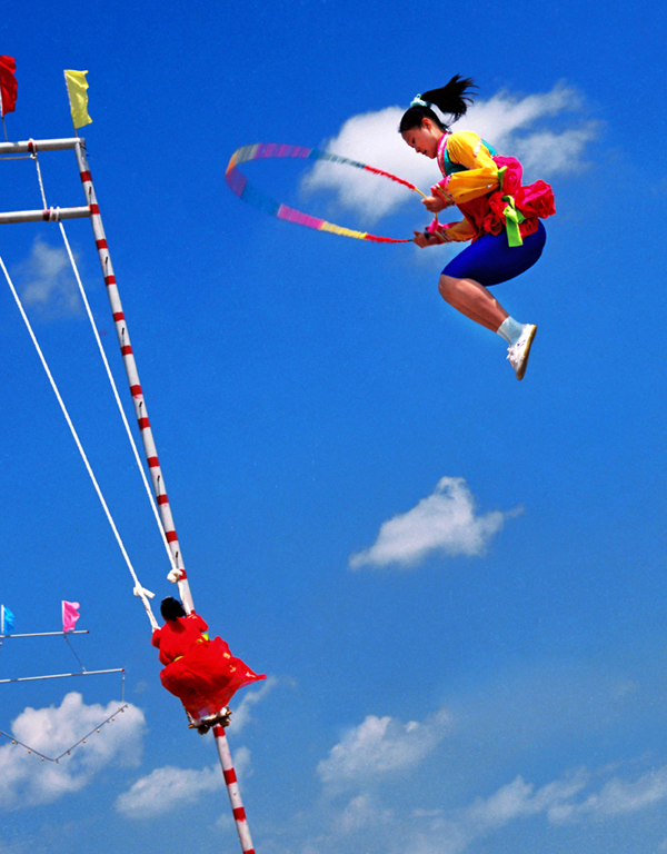 民間跳板長5.5米、寬4.0厘米左右,厚5.0至6.0厘米。跳板中間的下面立板墊,高3.0厘米。比賽時有專人守護(hù)板墊,防止跳板掉下。站在跳板兩端的姑娘輪番連續(xù)起跳,逐漸將對方彈送得更高。在身體騰空時能表演出驚險動作者最受歡迎,如剪式跳、旋轉(zhuǎn)跳、空翻跳,甚至跳藤圈、做造型、舞花環(huán)、揮彩帶等。靈巧優(yōu)美、五彩紛呈,令人眼花繚亂,驚嘆贊賞。