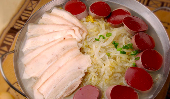 滿族有灌制血腸的習俗。多在臘月殺豬時制作。用豬血,加鹽、姜、辣椒粉、味精的調勻,灌入豬小腸之中,所用腸以不足二尺為宜,兩端用細繩扎牢,血漿不可充的太滿,以免煮時脹裂。煮到一定程度時要用一干凈的鋼針在腸上刺一些針眼,一則排放氣體以免膨脹迸裂,二則掌握火候,一俟沒有血水自針孔洞中滲出,即撈出冷開水或冷水中。食時片成片,可以直接夾食,也可以醮以醬油、醋、蒜泥、姜汁、辣椒油等食用。既鮮美爽口,又多食不膩,佐酒下飯均宜。