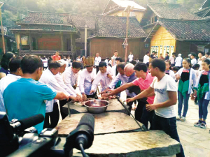 2016年9月1日(農(nóng)歷八月初一),貴州省從江縣高增鄉(xiāng)占里侗寨的男女老少同飲血酒,對石盟誓,重溫祖先誓言。