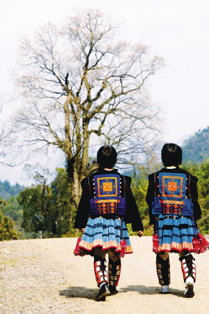 白褲瑤女人身上最惹眼的,除了百褶裙,還有她們衣服背后那一個(gè)個(gè)大大的方形圖案。傳說(shuō)900年前,白褲瑤首領(lǐng)有一方皇帝賜給的權(quán)印,被女婿以哄孫子為借口,借走并用假印調(diào)了包,瑤族人因此被趕進(jìn)山里,過(guò)起了少田缺水的游耕生活。為了告誡子孫不要忘記因?yàn)閱适?quán)力而導(dǎo)致苦難的教訓(xùn),從此,白褲瑤就在女人的馬鞍衣后面,繡上了一個(gè)形狀像首領(lǐng)印一樣的彩色方塊圖案。這是一種紀(jì)念,也是一種懷念。裙擺拂過(guò)落葉,一如群蝶穿越花叢。