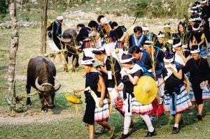 白褲瑤的喪葬習(xí)俗十分獨(dú)特,整個(gè)葬禮悲壯、肅穆,氣氛凝重莊嚴(yán)。參加葬禮的親友依次排隊(duì)順時(shí)針繞牛一圈,緬懷逝去的親人。2007年10月拍攝。