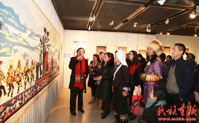 會(huì)上中國(guó)民族博物館黨委副書(shū)記、副館長(zhǎng)張志文向少數(shù)民族作家們介紹了展覽,他說(shuō):“土家族是一個(gè)歷史悠久的民族,現(xiàn)在有835萬(wàn)人口。土家織錦也有兩千多年的發(fā)展歷史,有250多種傳統(tǒng)圖案,是中國(guó)民間五大織錦之一,堪稱中國(guó)服飾文化中的奇葩。中國(guó)民族博物館從歷年征集收藏的300多幅清代以來(lái)的土家織錦中,選取了156幅精品土家織錦、21分鐘傳承人視頻和120余幅土家民族風(fēng)情照片。我們和中國(guó)婦女兒童博物館合作舉辦了這個(gè)高品質(zhì)的專題展,旨在傳承和弘揚(yáng)土家族國(guó)家級(jí)非物質(zhì)文化遺產(chǎn)?!?/p>