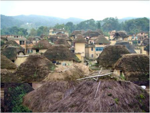 哈尼族一個核心的家庭的一幢完整的磨菇房,包括正房、左右?guī)?、庭院和圍墻等?shù)個建筑單元,家中配有腳碓、石磨、水缸、織機、藍靛染缸、犁、耙、刀、斧、鋤、籮和火塘等生產(chǎn)生活設(shè)施,滿足作為社會生產(chǎn)和生活單位的家庭的諸多需求。若干家庭的磨菇房逐次排列,就逐漸變成了一個哈尼族山寨的磨菇房群落。