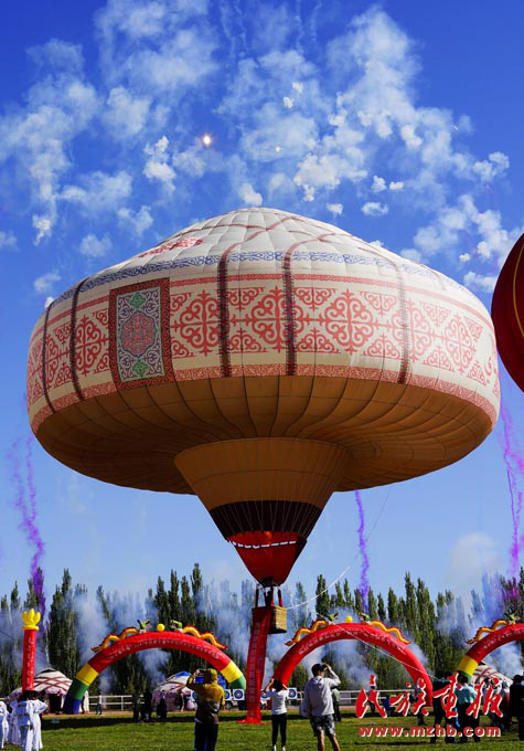 氈房是哈薩克族的傳統(tǒng)民居之一,是哈薩克族人游牧?xí)r居住的地方。圖中直徑長達(dá)21米、高23米、體積達(dá)2800立方米、通過世界紀(jì)錄協(xié)會(huì)認(rèn)證的這只阿克塞縣的旅游空中形象大使,是目前世上最大的哈薩克族氈房熱氣球