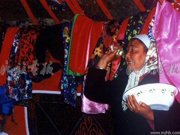 男方送給女方的牲畜及各種結(jié)婚用品準備好后,便要舉行“吉爾特斯”儀式,即展示彩禮。舉行此項儀式時男方請親戚來觀看準備送給女方的彩禮,同時參加儀式的親戚也帶一些禮物來,使彩禮更為齊全豐富。在舉行“吉爾特斯”儀式那一天,主人把用大毛毯包起并縫好的彩禮放在地毯上,然后從婦女中推選一個“剪彩”的人,剪彩的人把包裹剪開,把各種物品在氈房中陳列出來,雙方親屬便陸續(xù)前來觀賞男方送給女方的各種用品。