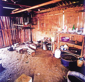 房內(nèi)一般隔成里外兩間,里間狹小,光線暗,是主人的臥室,只放雙人床和一小部分生活用品。外間寬大,是生火煮飯、聚會待客和子女就寢的地方?;鹛猎O(shè)在里間屋的門外,放鐵制三腳架,三腳架對應(yīng)的方位有固定的用途,即靠里間房門一方為主人的座位,靠外間房門一方為客人的座位,火塘上方靠墻處為子女的床位。如有成年子女和新婚夫婦,則在外間再隔出小間,里間和外間存放著生產(chǎn)用具和酒具。房內(nèi)幾乎沒有什么家具和裝飾性的陳設(shè),有的甚至沒有桌椅和床鋪,只在火塘周圍鋪著竹席或木板,合衣向火而眠?;鹛辽厦?米多高處懸掛著竹編的約1米見方的架子,上面放著食具、鹽巴、辣椒等,也是烘烤牛肉干的地方。架子上面靠房頂處并排放著幾個(gè)粗大的竹筒,里面存放糧食。這幾年的新村民居,在保持傳統(tǒng)民居特征的前提下使用了新型建材,更堅(jiān)固,更舒適。