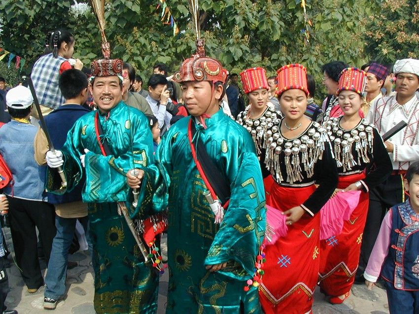 目瑙節(jié):又稱“總戈”,景頗語音譯,意思是“大伙跳舞”。目瑙節(jié)是景頗族最盛大的傳統(tǒng)節(jié)日,一般于每年農(nóng)歷正月十五以后的九天內(nèi)擇雙日舉行,節(jié)期三至五天不等。目瑙作為一種大型的群眾性歌舞活動,由來已久,歷史上,每逢豐年,出征、凱旋、婚姻嫁娶、敬祭鬼神等重要活動,均要跳“目瑙”。景頗族的“目瑙縱歌”原來是一種融宗教和文化習(xí)俗為一體的傳統(tǒng)慶典。隨著社會的發(fā)展,逐漸演化為各種不同類別的“目瑙”。大致有以下幾種:①“歲目瑙”,家庭財源茂盛,人丁興旺時舉行;②“布當(dāng)目瑙”,征戰(zhàn)取得勝利時舉行;③“貢冉目瑙”,同胞兄弟分家自立門戶時舉行;④“騰肯目瑙”,新建房屋住所落成時舉行;⑤“空然目瑙”貴族家娶親辦婚禮時舉行;⑥“達(dá)如目瑙”,出征時舉行;⑦“昔目瑙”,有名望的長者去世送葬時舉行;⑧“柱目瑙”,祭奠“木代”神時舉行。不同類別的“目瑙”都有特定的內(nèi)容和表現(xiàn)形式,但有一個共同點(diǎn)就是整個過程都是由“瑙雙”(領(lǐng)舞)隊和“瑙巴”(表演)隊組成的舞隊來表現(xiàn)和完成的。每逢目瑙節(jié)日,村村寨寨的景頗人身著節(jié)日盛裝,紛紛從四面八方涌入目瑙廣場。廣場上人山人海,氣氛熱烈歡快而不失莊嚴(yán)古樸的特色。廣場中央高豎著四根長約4米的目瑙柱,亦稱雌雄柱,中間兩根為陰,外面兩根為陽,上面皆繪有精美而富有象征意義的圖案:右邊柱上往往繪以蕨菜花紋,象征團(tuán)結(jié)奮進(jìn);左邊常畫回紋構(gòu)成若干個四方形,并涂以不同顏色,表示景頗族的遷徙路線;中間兩根柱子之間,交叉著兩把長刀,為景頗民族驍勇強(qiáng)悍、堅強(qiáng)剛毅性格的具體標(biāo)志。目瑙柱的左側(cè)立著一個方形架子,上層是吹嗩吶的座位;前面掛著一個兩米長的大皮鼓和一面直徑一米多的大芒鑼,供跳舞時伴奏用。廣場四周用竹籬笆圍起,目的是為了防止野鬼的侵入和牲畜的干擾。舞蹈開始時,鼓樂齊鳴,由兩位德高望重且又熟悉目瑙舞路線的老人身穿大龍袍,頭戴飾有孔雀、野雞羽毛和野豬牙齒的目腦帽,手持長刀領(lǐng)頭,后面跟著背銅炮和持長刀的隊伍,婦女們拿著扇子或彩帕跟在最后,邊歌邊舞,熱鬧非凡。參舞者少則百多人,多則幾千人,從清晨到日暮,以日暮到清晨,通宵達(dá)旦,其間舞者跳累時可自動退場小歇片刻,然后繼續(xù)登場舞蹈?!澳胯Эv歌”作為一個民族的傳統(tǒng)活動發(fā)展至今,宗教色彩和類別已日益淡化,它已成為景頗族約定俗成的傳統(tǒng)節(jié)日,統(tǒng)稱為“統(tǒng)肯(傳統(tǒng))目瑙”并賦予了新的內(nèi)涵,其內(nèi)容和形式都是展示一個民族的傳統(tǒng)文化,反映今天的新生活和對未來的美好向往。