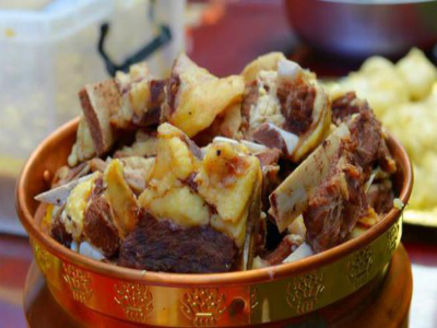 土族的日常飲食以面食為主,習(xí)慣于一日三餐。早餐吃饅頭、花卷或吃洋芋、糌粑,午餐比較豐富,有飯有菜,晚飯吃面條、面片、面糊糊等。除日常飲食外,土族的節(jié)日飲食也充滿特色。春節(jié)以油炸饃為主,有“包適左”(牛肋巴)、“盤馓”“馓子”等,一般吃手抓大塊大肉和手抓羊肉。端午節(jié)以韭菜做餡的油炸盒子、涼面、涼粉為主要食物。中秋節(jié)一般做千層月餅和熬飯。到了土族最重要的民族節(jié)慶納頓節(jié)時(shí),除備酒肉招待客人外,還會(huì)蒸大饃饃,送到會(huì)場供眾人食用。