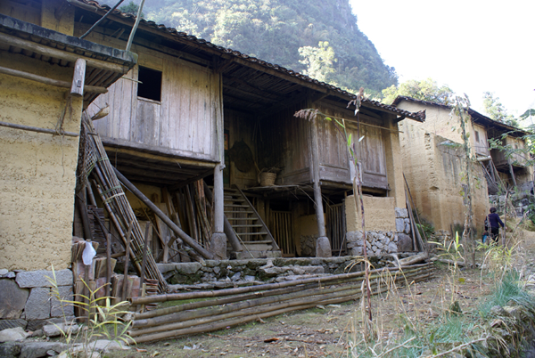 干欄石屋(亦稱干欄石樓)為進入20世紀后多數(shù)農(nóng)民的住屋,是凹形矮腳石木結(jié)構(gòu)干欄式,因墻基用石頭砌成而得名。上層住人,下層圈養(yǎng)牲畜及堆放農(nóng)具和柴草,可以防潮。整棟房為石基、泥墻、木柱、瓦頂。每棟以用銜條數(shù)和間數(shù)多少區(qū)別大小。從屋頂?shù)轿蓍軆蛇?,?3根銜條的叫檐十三,用15根的叫檐十五,以此類推。檐十三屋內(nèi)較窄,不便擺放家具雜物;檐十九較寬敞,但屋檐低矮,室內(nèi)陰暗。以檐十七居多,屋里寬敞,通風采光也良好。多為三、五、七、九間,大門居中,兩邊對稱。