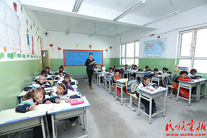 帕米爾高原上的塔吉克族孩子們?cè)谥袊?guó)建設(shè)銀行捐贈(zèng)的希望小學(xué)的明亮教室里上課(張建輝 攝影)