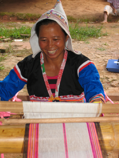 基諾族織錦色線的染色工藝有其獨特之處。染黑(青)布,采“咪叭”(即板藍根)鮮葉泡化去渣,加入石灰水攪拌充分合勻,煮水,把布投入水中翻動多次,撈出曬干即可,煮泡越透色越深。若染青色,只要浸泡一會即可。染黃線,采“合詩阿波”花(鼠鞠草)與線同煮即可。染綠色,采一種藤“阿紐克帕”和一種樹“資奪帕”的鮮葉與線同煮,加石灰水少許即可。染紅線,用“阿納切”樹根、“樸臘突”樹皮和紅高粱殼,加石灰水與線同煮即可。