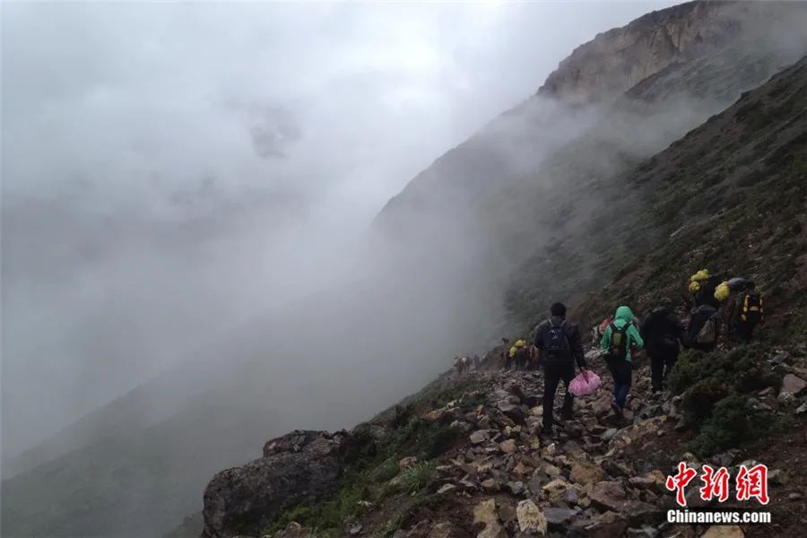 2013年,工作人員在日喀則茹村進(jìn)行古籍普查。山洪暴發(fā)沖毀道路,大家走在山間的亂石上。受訪者供圖