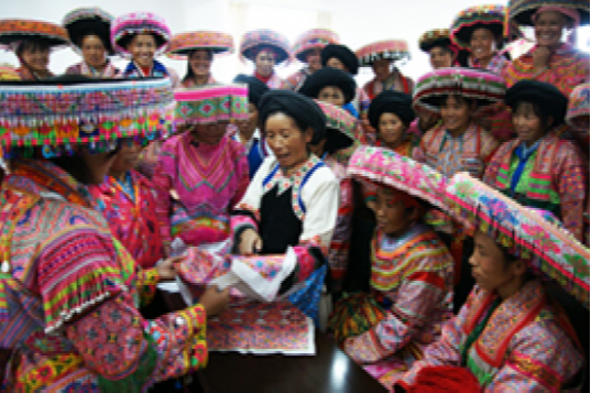 云南省南澗傳統(tǒng)的苗族服飾,均用多色麻線制作而成。在苗族服飾中,最讓人新奇的是女人的頭飾。苗族姑娘,習(xí)挽犄角形單發(fā)髻于頭頂,并將髻編于左或右。束發(fā)常用紗、綢帶,不同的苗族支系,采用的紗、綢顏色和花紋也有所不同,有的還佩戴系有“百家鎖”的銀項(xiàng)圈等。已婚婦女,一般都行編發(fā),并將發(fā)辮沿頭頂邊緣繞起來(lái),而且多以彎月形的梳子卡插于發(fā)盤頂心。在苗家人中,婦女的頭飾尤其特別,每逢喜事,他們都挽發(fā)髻如螺形,用較長(zhǎng)的青布或黑布,按縱向折疊為長(zhǎng)條,由一端起緊緊地盤繞于適合自己頭型的頂制帽基上。在疊繞成的大包頭之最外層表面上,配縫以彩帶垛疊的橫條,釘以32-48個(gè)貝雕,環(huán)圈密綴十字形亮子線,懸垂約5厘米的小銀鏈數(shù)10條,以及小銀鈴若干串。除精制的頭飾外,苗族女人的上衣下著都頗具特色。上衣有平裝和禮裝,下著有各式褶裙,腰上系的有桃花圍腰或有須腰帶。有的還有精美別致的短衣,也有特顯精巧的無(wú)袖布褂,以及彩繡鑲邊的布涼鞋等。在繁多的苗族服飾中,最顯著的特色是,不論衣裝大小,也不論上衣下著,在衣領(lǐng)、袖口、裙邊、裙底上,都鑲有臘染圖案和“米”字形花紋的條幅。苗家人穿上自己繡制的服飾,情趣非同一般,尤其是那些將要出嫁的大姑娘或已經(jīng)過(guò)門的新娘子,更會(huì)把自己打扮得花枝招展,漂亮迷人,對(duì)自己美如畫卷的服飾她們也是珍愛(ài)如寶。苗族男人的服飾,比女人簡(jiǎn)單,上衣為對(duì)襟短衣,下著褲子,一般也以短褲較多,頭飾多為半球形布帽或頂發(fā)外露的青色小包頭,但都有精制彩繡垛邊。大量使用飾物和刺繡,是苗族服飾的最大特色。