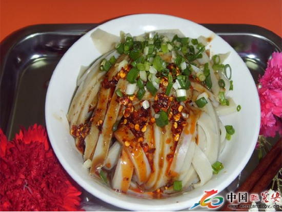 貴州甕安的豌豆涼粉獨具特色,歷史悠久,據(jù)說它的產(chǎn)生也有200年歷史。豌豆涼粉制作特別,工序多、時間長,技術(shù)十分精巧。它的原料是豌豆,吃豌豆涼粉之所以考究就在于它不用醬油,也不直接放食鹽調(diào)味,而是用特別的加了鹽的風豆豉醬。食用時,可用刀切成條、塊、片、絲狀盛在碗里,配以蔥花、姜米、蒜水、紅油辣椒和風鼓醬涼拌即可。