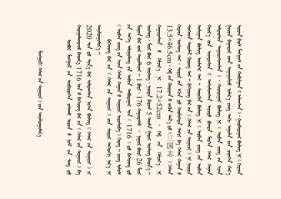 今天我們主要講述的是1716年北京木刻本蒙古文《格斯?fàn)杺鳌罚ㄈQ為《十方圣主格斯?fàn)柨珊箓鳌罚┦乔蹇滴跷迨迥辏?716)北京木刻本。梵夾裝,1卷(176葉),每頁26行,每行6個字,約5萬多字,頁面高17.2cm、寬52cm,版框高13.5cm、寬46.5cm。版框左側(cè)有漢文《三國志》三字,首頁刻有朱印佛像。