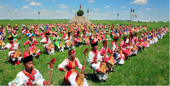 馬頭琴常出現(xiàn)在民間的婚典儀典和親友聚會等日?;顒又?。既可獨奏,亦可為歌伴奏。馬頭琴的傳統(tǒng)曲目多從民歌中演化而來,可分為五類:1.原生民歌,如《朱色烈》、《八雅鈴》;2.英雄史詩曲牌,如《奔馬調》、《打仗調》;3.馬步調,即表現(xiàn)馬形象的曲調;4.從民歌發(fā)展而來的琴曲,如《荷銀花》、《莫德烈》等;5.漢族古老曲調,如《普安咒》、《柳青娘》等。