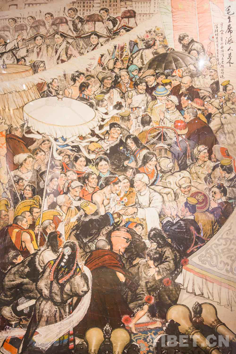 鑒賞展現(xiàn)場(chǎng),不少前來(lái)參觀的畫(huà)家都是韓書(shū)力的學(xué)生或在一定時(shí)期曾受其教導(dǎo)?!?973年,我在西藏自治區(qū)展覽館見(jiàn)到了韓書(shū)力老師,第一次見(jiàn)面我就拜了師。我們一起下鄉(xiāng),我就給他當(dāng)導(dǎo)游和翻譯。30幾年來(lái),我一直在學(xué)習(xí)韓老師的繪畫(huà)技法,到現(xiàn)在還是他的學(xué)生。韓老師創(chuàng)作《毛主席派人來(lái)》時(shí),我就跟在旁邊學(xué)習(xí)。學(xué)到了一些創(chuàng)作獨(dú)幅作品的技巧和手法,讓我受用至今?!蔽鞑厍嗄戤?huà)家計(jì)美赤列說(shuō)。