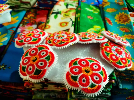 不得不說,每一個(gè)惠安女似乎都是天生的刺繡好手,即便是單調(diào)的布料,簡(jiǎn)單的幾何圖形,在她們的手中能成為搭配巧妙的服裝。