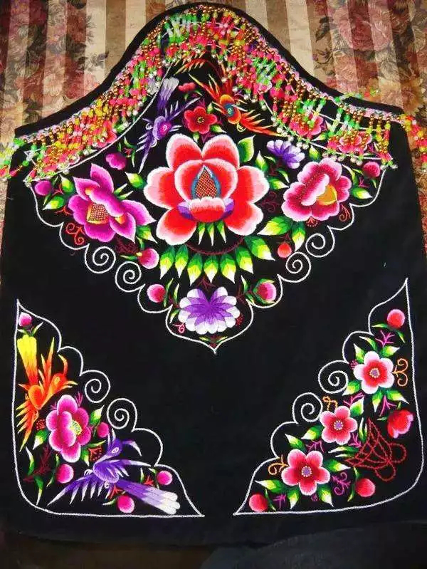 彝族婦女圍腰,是女性審美的結(jié)晶,實(shí)用美觀。圍腰是最能集中體現(xiàn)彝族女性心靈手巧的女紅作品,因此成為青年男子傳統(tǒng)擇偶的重要標(biāo)準(zhǔn)之一。每條彝族圍腰,須經(jīng)過剪紙、裁剪、刺繡、挑花、配飾等環(huán)節(jié),每一個(gè)細(xì)微的過程都傾注了彝女的聰明與才智。事實(shí)上,彝族婦女圍腰,還蘊(yùn)含著重要的彝族社會(huì)歷史、文化信息。