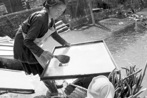 占里村共有182戶827人,這里的侗族古法造紙術(shù)源遠(yuǎn)流長(zhǎng),全村從事造紙業(yè)的就有170戶,占總戶數(shù)的93%。這里的造紙業(yè)依然保留著原始的家庭作坊和世代傳承的手工制作方式。這種古法造紙技藝以構(gòu)樹(shù)皮為原材料,添加獼猴桃藤、野棉花根,經(jīng)過(guò)水浸泡、石灰腌制、蒸煮、碓爛、攤曬、燒堿漂白、打漿、瀝水、抄紙、烤干等72道工序,最終制成白皮紙。