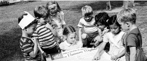 1950年,聯(lián)合國國際育童學(xué)校的孩子們在閱讀第一張《世界人權(quán)宣言》的海報。