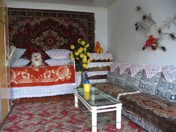 木刻楞房的室內(nèi)結(jié)構(gòu)一般有客廳、臥室、廚房和儲藏室四部分構(gòu)成,房屋的整體結(jié)構(gòu)呈四方形,建造有傾斜度較高的屋頂,利于雨雪不會覆蓋在屋頂,從而造成屋頂承重過高而發(fā)生坍塌。此外,俄羅斯族人一般都會選用紅色、藍色或者綠色的鐵皮將屋頂精心包裹一番。這不僅可以起到很好的防風御寒、防止雨雪滴漏進室內(nèi)的效果,而且也使木刻楞房色彩十分和諧艷麗。房屋的正門之前一般會建造寬闊的門庭和圍廊,門內(nèi)有過道,過道兩旁是臥室和客廳。室內(nèi)的墻角有土坯壘砌的火墻。有的人家是大型壁爐,外包一層鐵皮,鐵皮上抹一層黑油,俗稱“毛爐”,是很好的取暖設(shè)備。室內(nèi)陳設(shè)比較講究,臥室擺放著木床或鐵床,鐵床欄桿雕有花草圖像,給人以古雅之感。木刻楞房室內(nèi)一般會在地面鋪上木地板,俄羅斯族人們也十分喜愛在家中鋪設(shè)飾有各類花紋圖案的地毯。