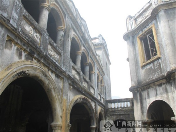 如果說(shuō)尚德堂是中西混血兒的話,他的兄弟“松柏莊”就是純正的“英國(guó)帥哥”?!八砂厍f”具有英國(guó)新式古典建筑風(fēng)格,共分為兩層,北面設(shè)有陽(yáng)臺(tái)。陽(yáng)臺(tái)及門窗上部均是圓弧形,用帶有高級(jí)的石膏線勾邊。陽(yáng)臺(tái)由數(shù)十條羅馬柱支撐,檐口用西洋線腳裝飾,具有英國(guó)新式古典建筑風(fēng)格。建筑墻體為白色,與墻上“松柏莊”三個(gè)黑色大字相映,十分顯眼,盡顯歐式建筑色彩的視覺(jué)沖擊效果。老宅有些殘舊,但墻上的雕畫仍然凹凸有致,圖案清晰可見(jiàn),這無(wú)一不表露這家主人曾經(jīng)的輝煌。
