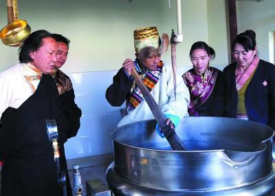 該遺產(chǎn)項目代表性傳承人明珠(左)指導(dǎo)瀧沐覺堪(制藥師)煎熬“五味甘露”。關(guān)確才讓 攝