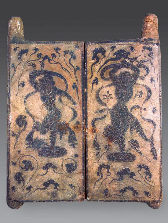 每扇門均呈長(zhǎng)方形,上下有圓柱狀榫,兩門閉合處各有一孔,出土?xí)r有鐵鎖鎖扣。每扇石門正中淺雕一“胡旋舞”男伎。所刻男伎為典型的胡人形象:虬髯卷發(fā),深目高鼻,寬肩細(xì)腰,體魄健壯。身著圓領(lǐng)緊身窄袖衫,下著緊腿裙,腳穿長(zhǎng)筒皮靴,站立在一塊編織精美的小圓毯上,雙人對(duì)舞。舞姿造型略有不同,左邊舞伎側(cè)身回首,左腳站立圓毯上,右腿后屈,左手正微微上舉,右臂屈至頭頂;右側(cè)男伎右腳立毯上,左腿前伸,雙臂上屈,至頭頂上方合攏。兩人均手舉長(zhǎng)巾,熟練揮旋。四周剔地淺浮雕卷云紋,似舞伎騰躍于云氣之中,造成流動(dòng)如飛的藝術(shù)效果。整個(gè)畫(huà)面構(gòu)思精妙,主題突出,人物面部表情生動(dòng)自然,體態(tài)輕盈健美,舞姿迅疾奔放、充滿歡樂(lè)生活氣息。
