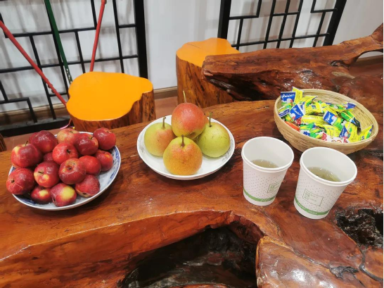 剛踏進(jìn)傳習(xí)所,就見何松康老師已準(zhǔn)備好茶水以及時(shí)下最新鮮的花紅、梨子等水果候著我們到來了。對(duì)于每一位來到傳習(xí)所了解白族霸王鞭文化的訪客,她都熱忱相待。