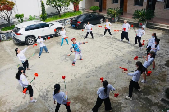 在時(shí)間不沖突的情況下,每天下午的三點(diǎn)至五點(diǎn)何松康都會(huì)到慶洞完小教同學(xué)們打霸王鞭,身體力行傳承人“非遺進(jìn)校園”的職責(zé)。此外,百川中學(xué)、銀橋中學(xué)等周邊學(xué)校都留下了何松康教霸王鞭的身影,“非遺傳承要從娃娃抓起”,這句話,她一直在踐行。