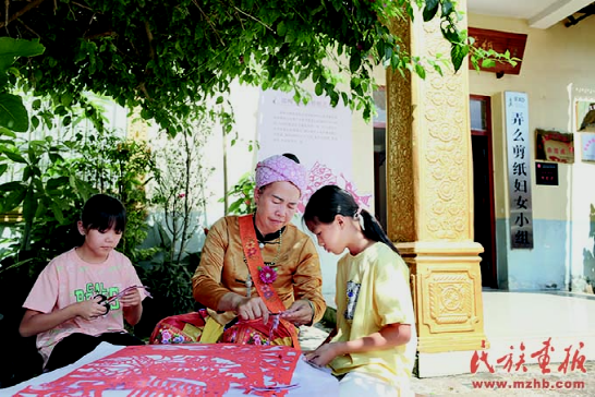 邵梅罕在剪紙藝術館前教孫女們傣族剪紙。