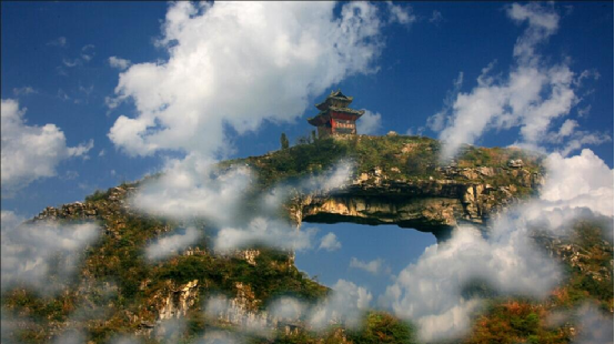 仙橋山位于貴州甕安縣城西南5公里的仙橋村,雄峙于南北伸展的長嶺之巔。山頂有一長方形穿洞,遠(yuǎn)望似一面中天明鏡,又若仕女發(fā)髻上的一匹玉簪。民間傳說,那高懸的“橋洞”,是神通廣大的仙人張三豐發(fā)怒時(shí)一拳擊穿的。站在“橋”下仰望“橋”頂,如巨粱橫亙天際,青崖黛壁,輝映云天。天衣無縫的“橋身”和兩邊的“橋墩”,渾然一體,構(gòu)成跨度約40米,寬20米,高約35米的“橋拱”?!皹蚬啊北泵娴摹皹蚨铡蹦_有形狀各異的石洞,曲徑相通。洞壁有形似人腳印石凹,傳說是仙人張三豐到此云游留下的足跡。