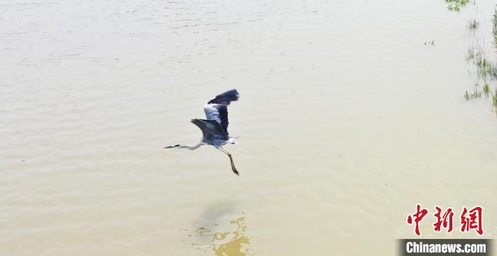 鳥兒在南宮湖濕地公園飛翔?!√锿z