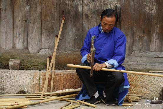 制作蘆笙大的工序有12道,再細(xì)一點(diǎn)有幾十項(xiàng)。如第一道是到山上去選竹子,拿尺子慢慢比劃,三拳的有多長,要很細(xì)心地選,確實(shí)可以用。取下來之后,第二道工序是拿到河邊去洗,用紗布搓。因?yàn)橹窆苡泻芏喟唿c(diǎn),關(guān)節(jié)處有很多毛,要很細(xì)致的把那些東西全搓掉。弄好之后用太陽曬,曬干曬白。第三道工序,就是取杉樹的木頭做笙斗,計(jì)劃好做三拳的是多少公分,四拳是多少公分。十二道工序,后面越學(xué)越復(fù)雜,每一道工序都很講究。