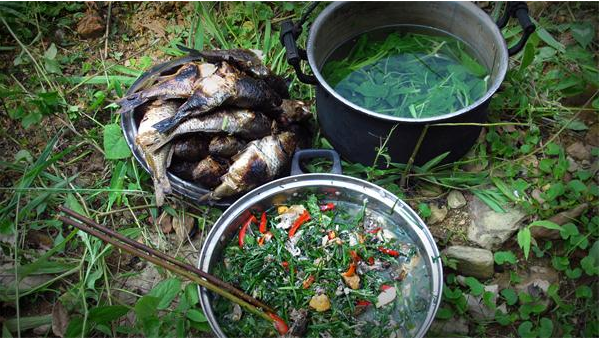 打魚湯也獨(dú)具特點(diǎn),先用缽頭盛好冷水,放入佐料和魚仔,再把洗凈的鵝卵石放進(jìn)火炭中燒的通紅,然后放進(jìn)缽里,反復(fù)多次,直至把魚湯燒開,魚仔和佐料燒熟,味道特別新鮮可口。